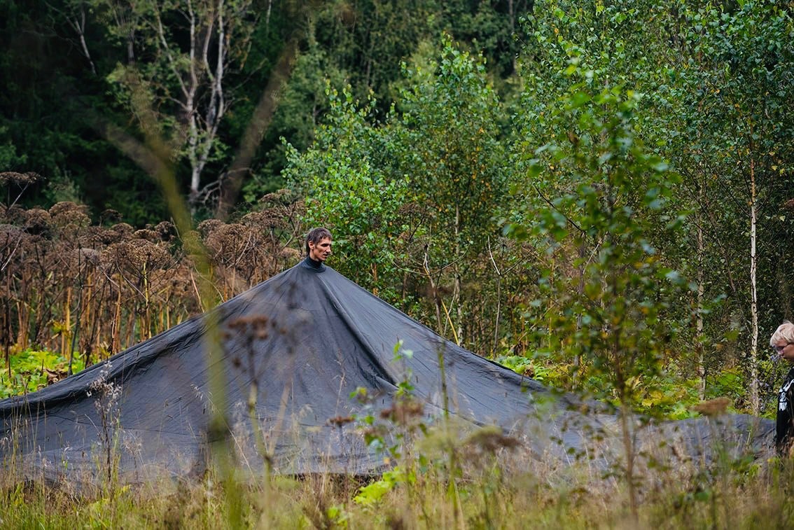 Посреди поля стоит покрытый черной тканью человек, но видна всего лишь его голова. Что прячется под покровами ткани остается лишь гадать и зрителю предлагается выразить предположения на бумаге, сравнив свои мысли с другими зрителями.