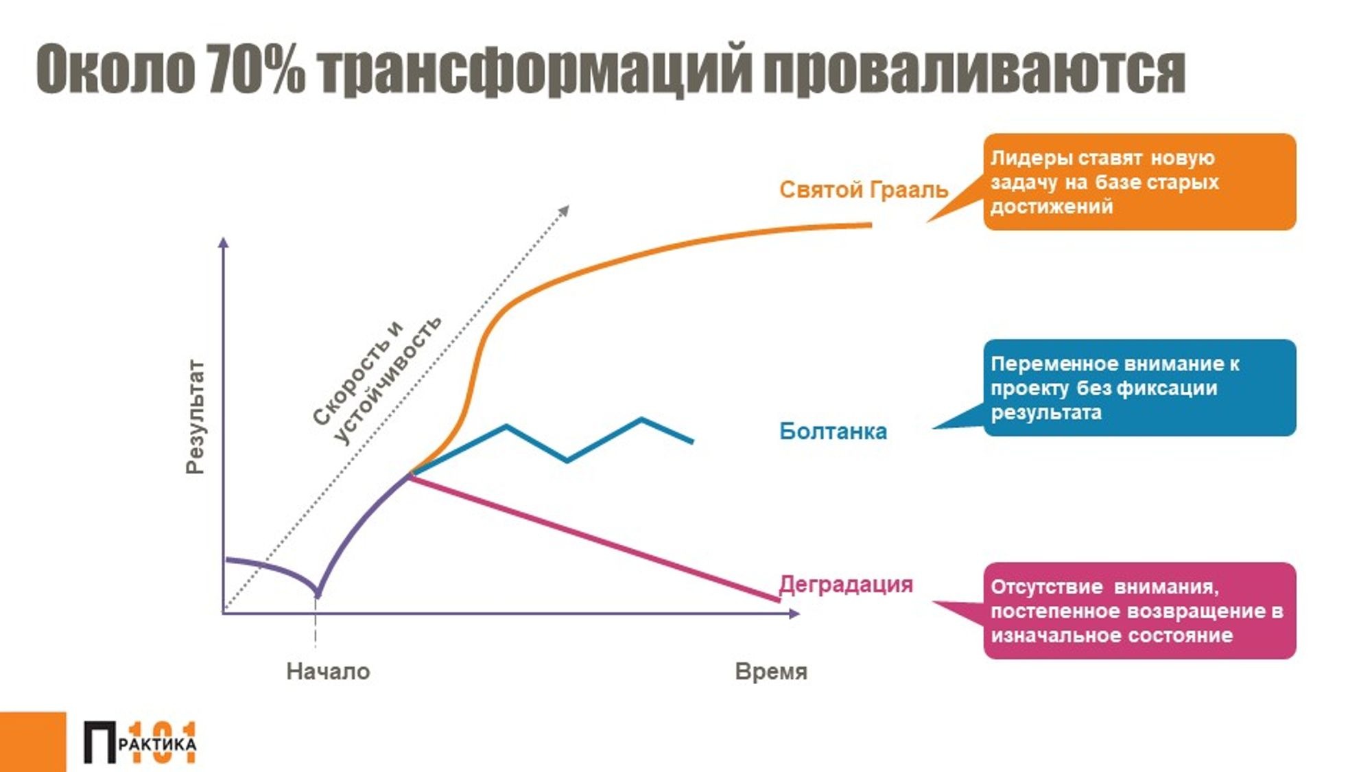 Alexander SheinКак я уже писал в предыдущих постах, большинство трансформаций проваливается из-за недостатка внимания, ресурсов, неверной приоритизации или нечеткого контроля. Мы знаем, что около 70% трансформаций проваливается. Это число может быть больше или меньше, понятно, что оно зависит от того, насколько далеко уже прошла трансформация в организации, и сколько людей знают об особенностях изменения своего бизнеса.