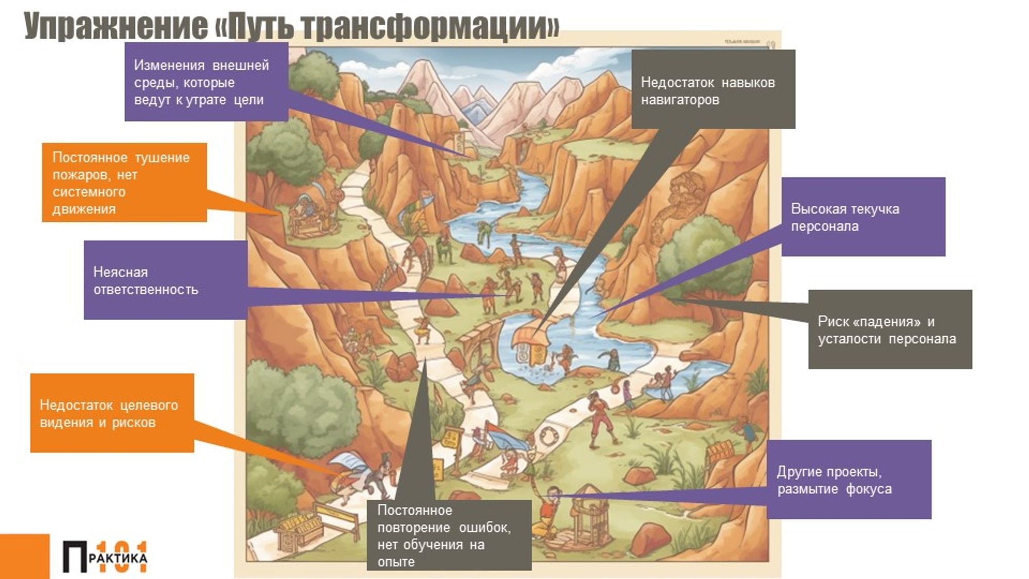 Ниже приведен пример одного из упражнений, которые мы проводили с клиентами, где обсуждались потенциальные сложности и проблемы, которые могут возникнуть в процессе трансформации, а также то, как на них можно будет реагировать.