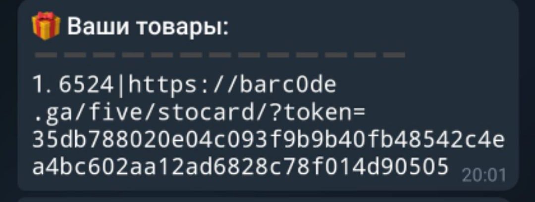 4. Если связи в пятёрочке нет, то ссылка не откроется. В таком случае связь восстанавливается в течение 24ч и работоспособность ссылки продлевается с 1 часа до 24 часов. Спрашиваем в чате есть ли связь в пятерочке, если ответили : "Есть" ,то идём в ближайшую пятерочку и непосредственно перед входом совершаем покупку в боте, нам выдадут ссылку на товар в таком виде