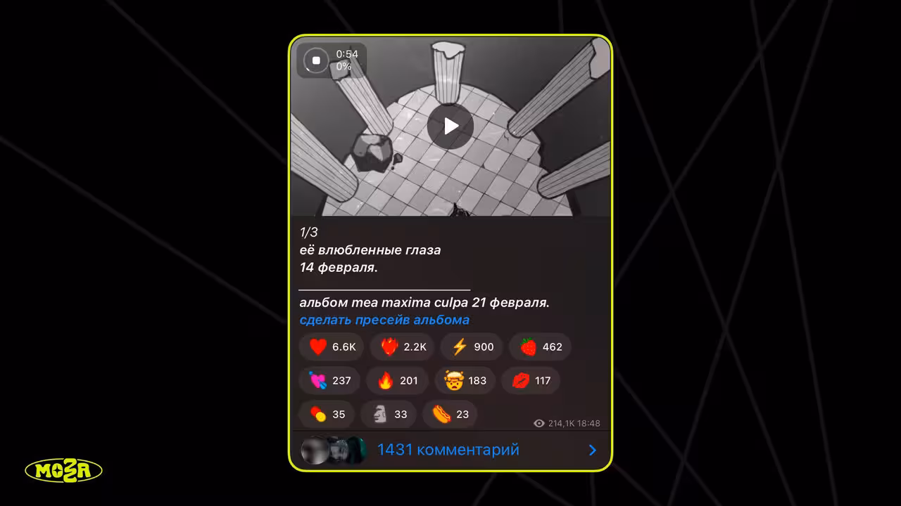 • Тизеры – 100 000 руб. Да, это были те самые анимированные тизеры — два сниппета под ключевые треки альбома. Например, «1/3 — её влюблённые глаза», вышедший 14 февраля. Сделаны они в эстетике Pyrokinesis: метафорично, круто, драматично. Цель — прогрев. А еще чтобы в комментах писали «че за мульт дайте название». Сработало: народ форсил, слушатели начали строить теории и активнее оформлять пресейвы. Однако, вышло всего 2 тизера.