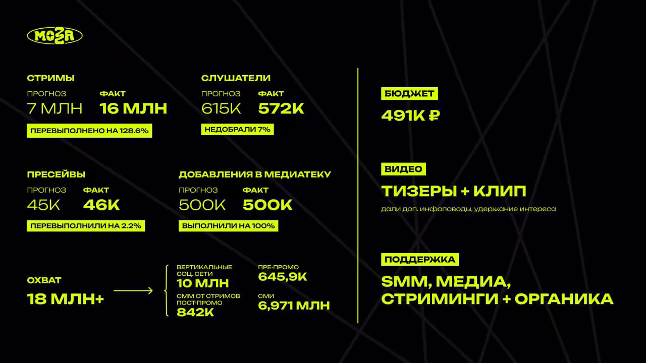 - SMM: В день релиза и последующую неделю мы получили мощную поддержку от стримингов. Релиз осветили все основные российские площадки: Яндекс Музыка, ВК, Звук, МТС Музыка. Благодаря ним кол-во охватов возросло до 842 000. Жесть, спасибо!
