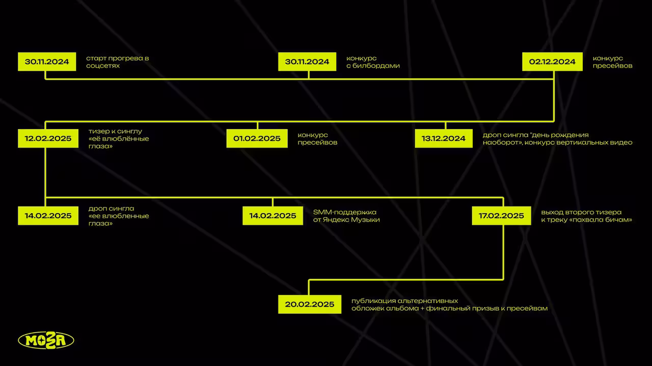 Перед релизом альбома mea maxima culpa мы выстроили линейное, многослойное препромо. Цель — создать ощущение движения, усилить интерес к артисту, вернуть внимание и построить вокруг релиза внятный, живой контекст. Мы не кидались разрозненными постами — мы растянули кампанию на три месяца и сделали так, чтобы от нее не уставали, а вовлекались.