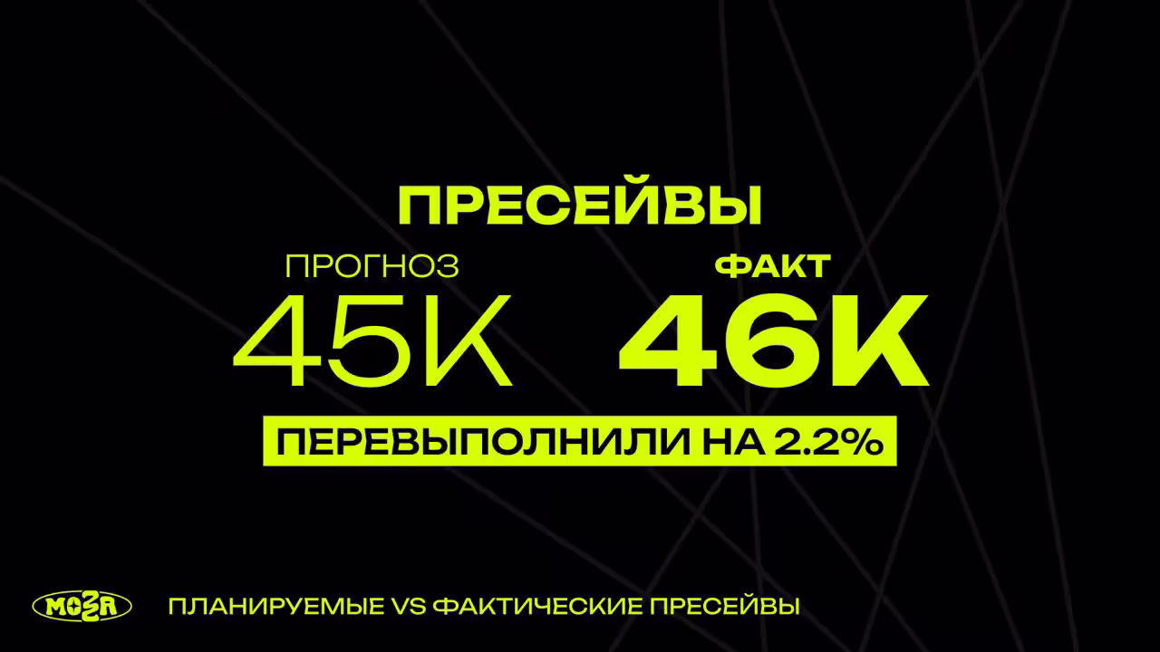Вывод по пресейвам: Механика с призами зашла. Хотели собрать 40–50к, но цель обозначили на 45к, в итоге получили — ~46к пресейвов. Планка пробита. Мы довольны.