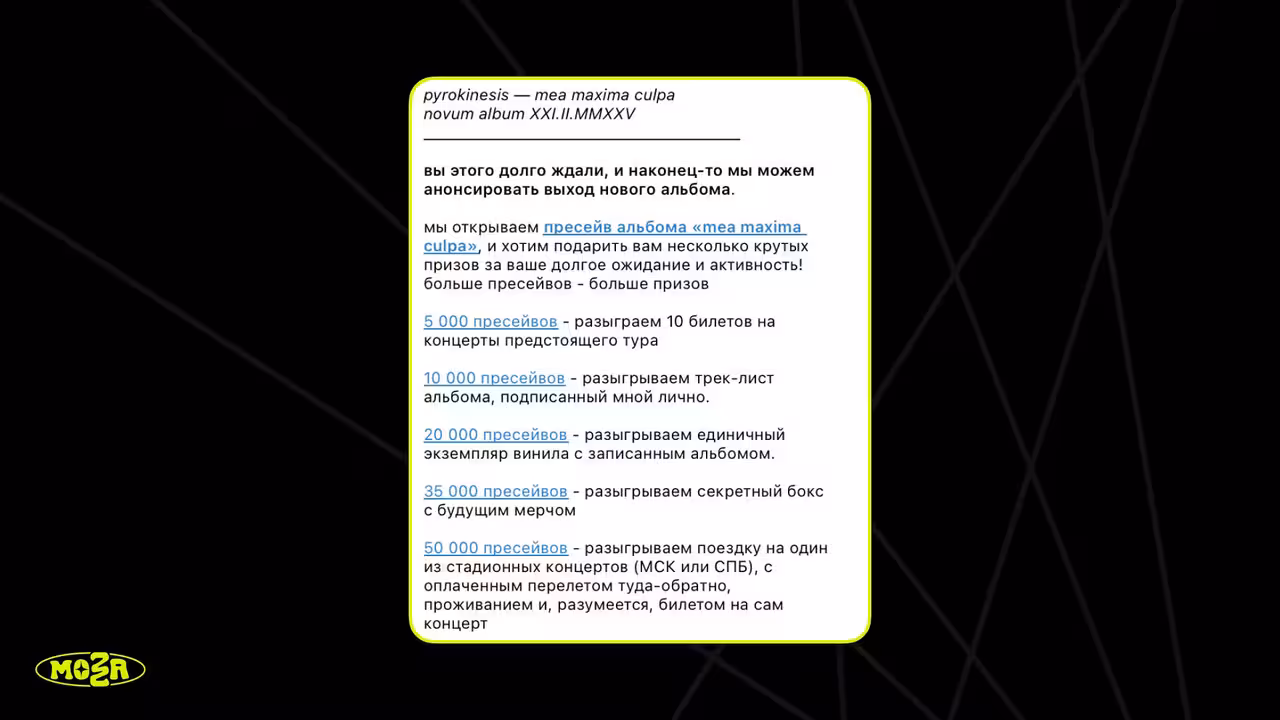 MOZAНу что, отчёт так отчёт. Мы подготовили лонгрид про то, как выпускали альбом Pyrokinesis – «mea maxima culpa». Будет живо и по делу: расскажем о пресейвах, стримах, бюджете, промо и охватах, без прикрас