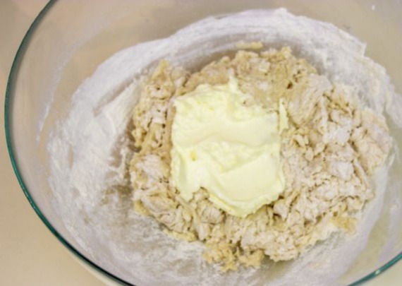 3. Затем добавить мягкое сливочное масло и замесить тесто. Вымешивать тесто в течение 7 минут. Можно добавить еще грамм 50 муки, не больше. Тесто эластичное и не липнет к рукам.