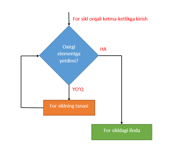 Quyidagi sxemada Python da for ning ishlashini keltirilgan: