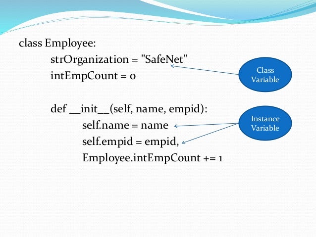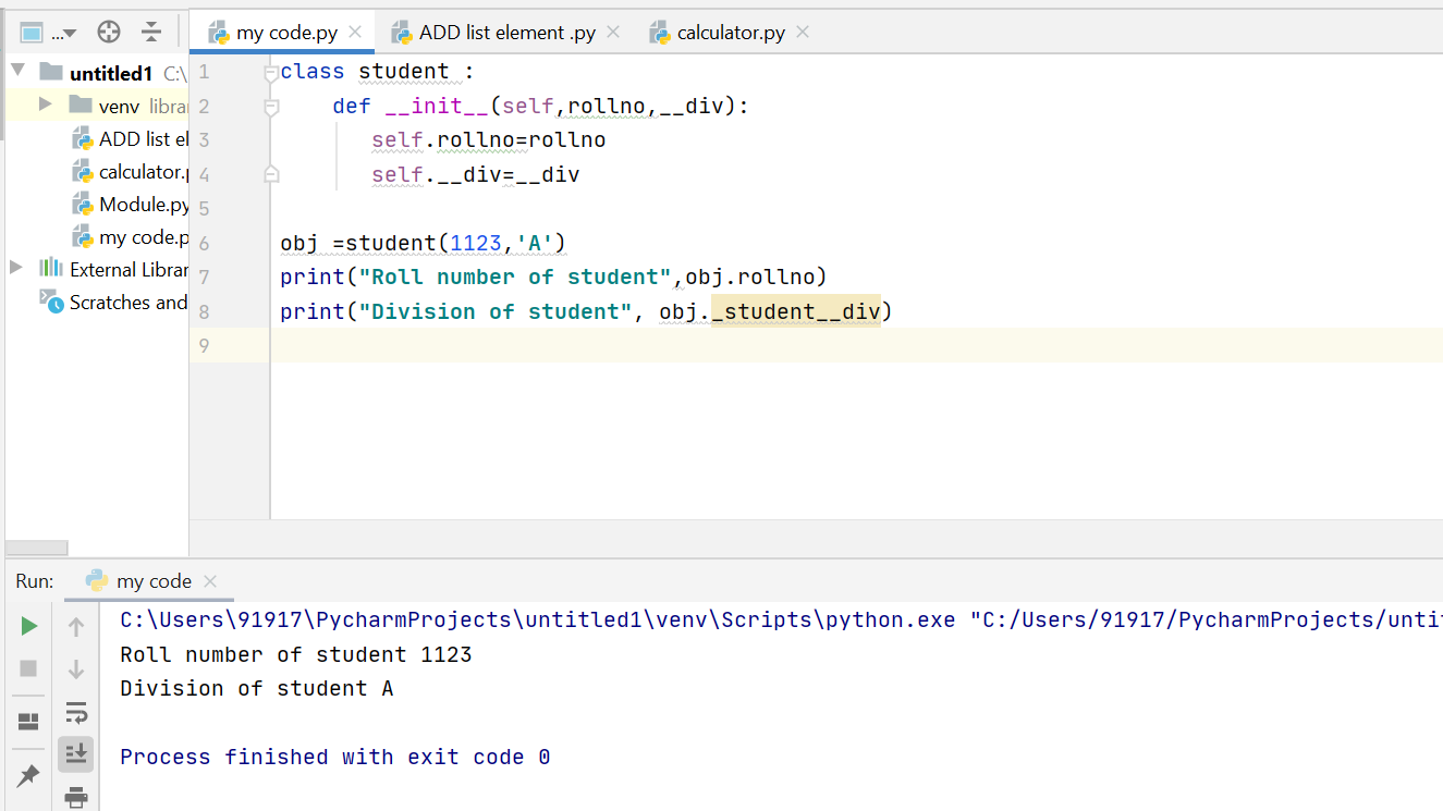 So from the above example, we can understand that all the variables and the methods inside the class are public by the method. When we declare data member as private it means they are accessible only side the class and are inaccessible outside the class. The technique of making a variable or method private is called data mangling. Any identifier of the form __spam (at least two leading underscores, at most one trailing underscore) is textually replaced with _classname__spam , where classname is the current class name with a leading underscore(s) stripped. This mangling is done without regard to the syntactic position of the identifier, as long as it occurs within the definition of a class.