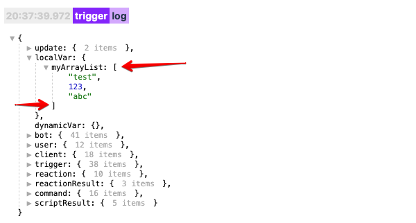 Макрос позволяет делать различные манипуляции со списками(массивами, Array в терминологии JavaScript). Для работы с этим макросом, у вас должен где то лежать список(массив) элементов. Это может быть локальная или глобальная переменная, или какой то результат выполнения скрипта. Найти список(массив) можно в логах. В логах списки(массивы) помечаются квадратными скобками [ ... ]: