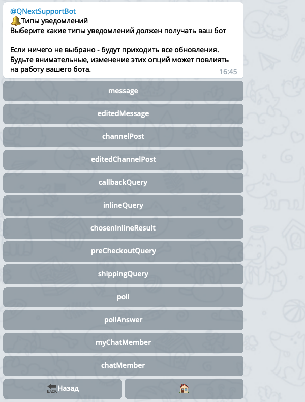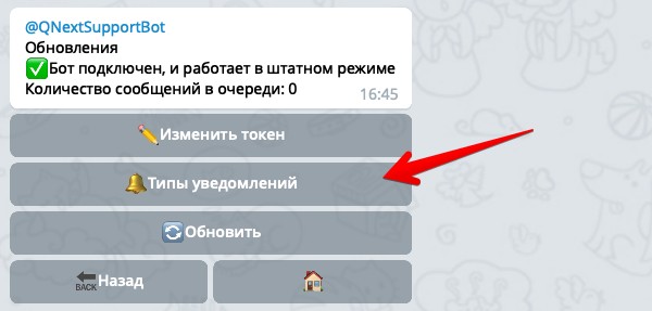 В настройках вашего бота внутри @QNextBot есть раздел: ⚙️Обновления -> 🔔Типы уведомлений: