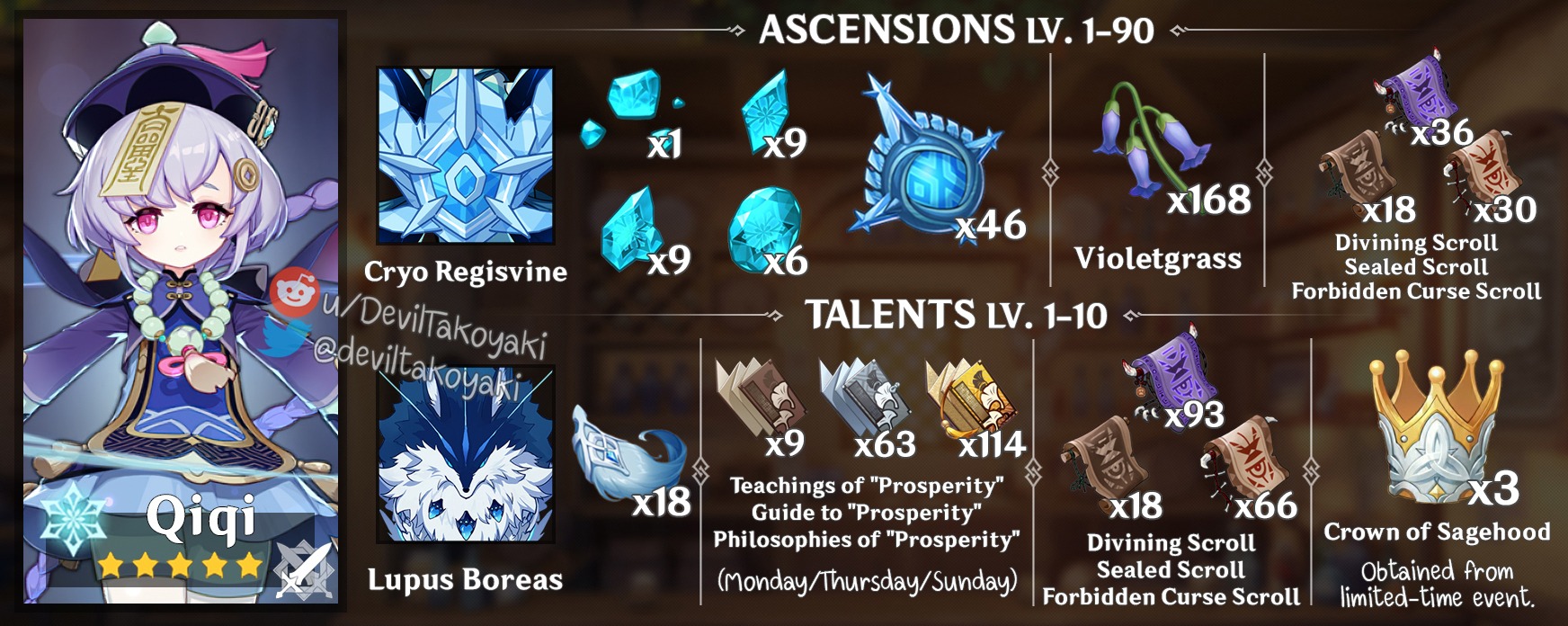 Set consigliati: full ocean o full millelith (può essere più efficace del noblesse, ma procca solo a distanza melee e meglio se si usa la sacrifical) o full noblesse (qiqi fatica con i burst) o gladiator-maiden