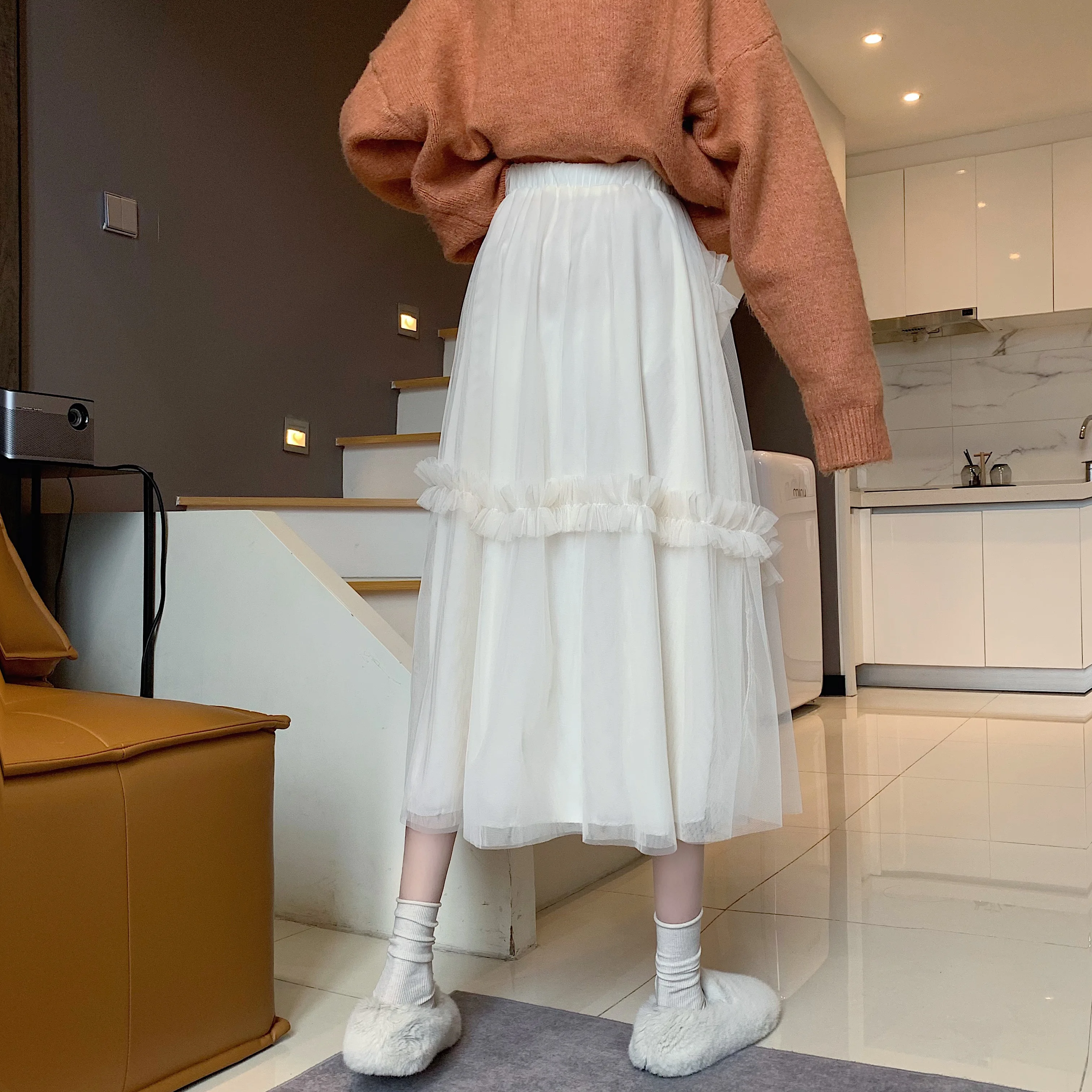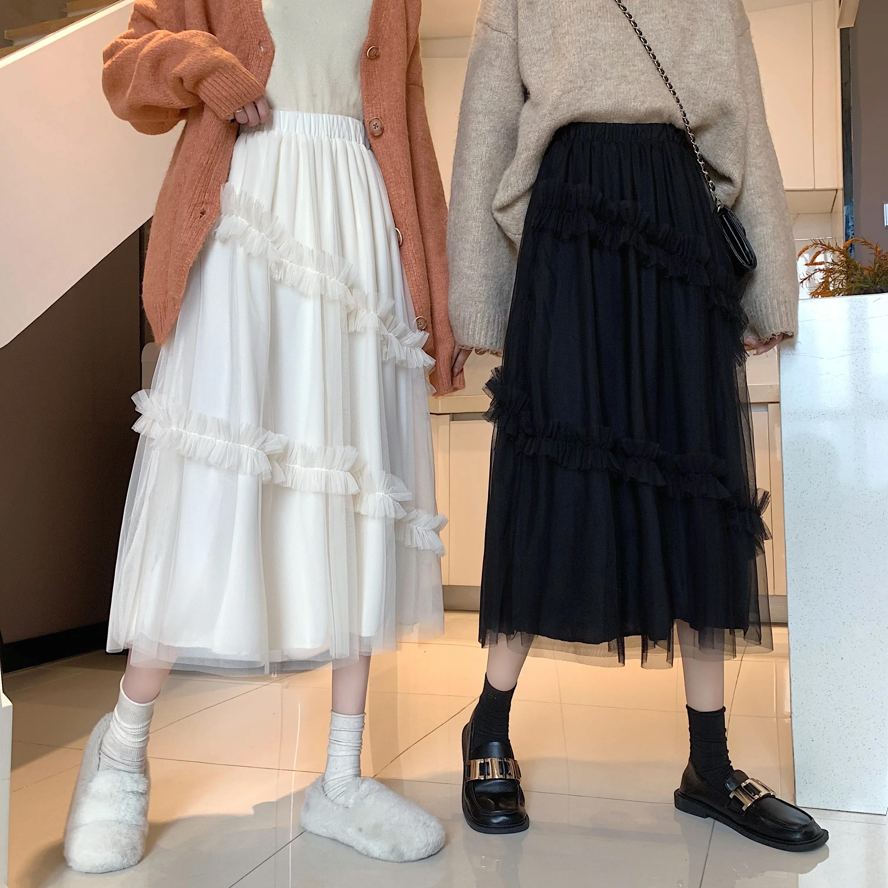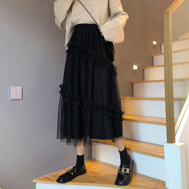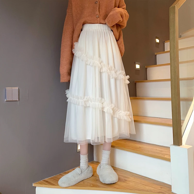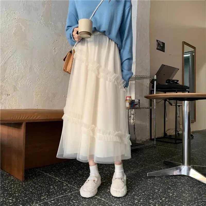 "Qiukichonson Long Tulle Midi Skirts Womens 2021 Lolita Summer Mesh Skirt Japanese Style High Waisted Ruched Ruffle Skirts rok" * Buy Now Just For 18$