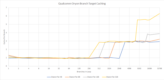 Qualcomm could have a branch address calculator placed early in the decode pipeline. With that interpretation, Oryon would have a 8 KB L0 instruction cache with single cycle latency. The 192 KB L1i would have 3 cycle latency. Oryon’s BTB setup has parallels to Kryo’s, as both cores enjoy fast branching as long as the test fits within 8 KB. It also shares traits with M1, which also sees taken branch latency increase as the test exceeds certain code footprint sizes. M1 however only gets single cycle branching within 4 KB.