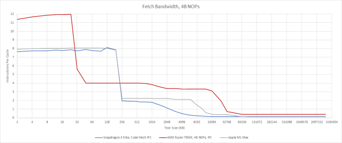 However, AMD maintains high frontend bandwidth for very large code footprints, as it can sustain more than 12 bytes per cycle even when pulling code from L3. Oryon and M1 have much lower code fetch bandwidth after a L1i miss.
