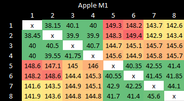 Nuvia’s co-founder used to work for Apple, making M1 is a notable comparison point. Apple also uses quad core clusters with a shared L2. However, M1 uses a hybrid core arrangement. Core to core latency is similar within a cluster. Cross-cluster transfers incur high latency much like on Snapdragon X Elite, though absolute values are a bit better.