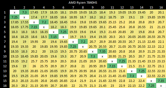 Snapdragon X Elite’s main competitors will be AMD’s Phoenix and Intel’s Meteor Lake. AMD’s Phoenix SoC has eight Zen 4 cores with 16 MB of L3. All eight of Phoenix’s cores are placed in the same cluster, so a core to core latency test is pretty boring to look at. Latencies are very low overall. However, it’s worth noting that AMD’s cross-cluster latencies on 16 core desktop Zen 4 variants is still better than Snapdragon X Elite or M1’s, at 80-90 ns.