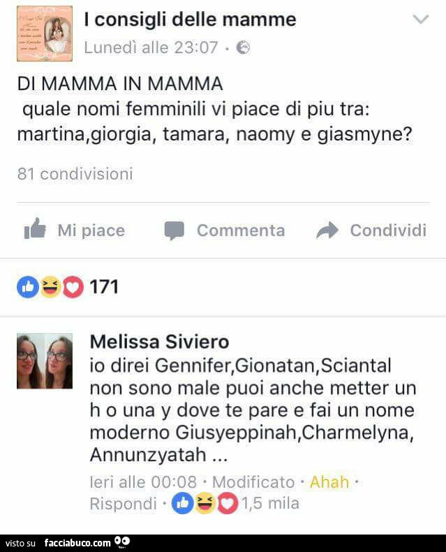 Quale vi piace? (Possibilmente uno solo) Giulia, Irene, Azzurra, Asia, Sofia, Alice . Rispondi Salva . 22 risposte . Classificazione . Felice Mastronzo . Lv 4 . 6 mesi fa . GIULIA oh mia cara ti prego salvami tu! Comunque Giulia è il più elegante per me . . . .