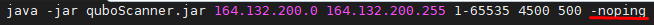 java -jar quboScanner.jar 164.132.200.0 164.132.200.255 25565-25577 1500 500