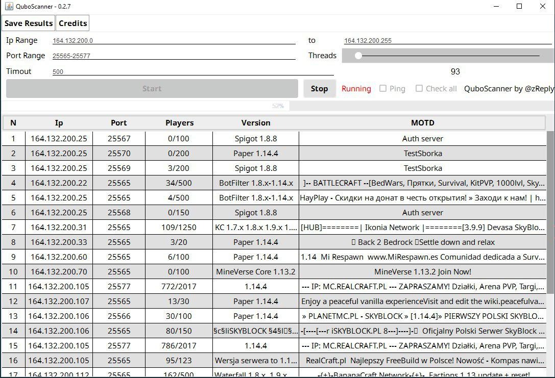 QuboScanner is based on the initial arguments, so before sending it is necessary to enter the following information: initial ip (such as 164.132.200.0), final ip (such as 164.132.200.255), the port range (such as 25565-25577), the number of threads and the ping timeout.