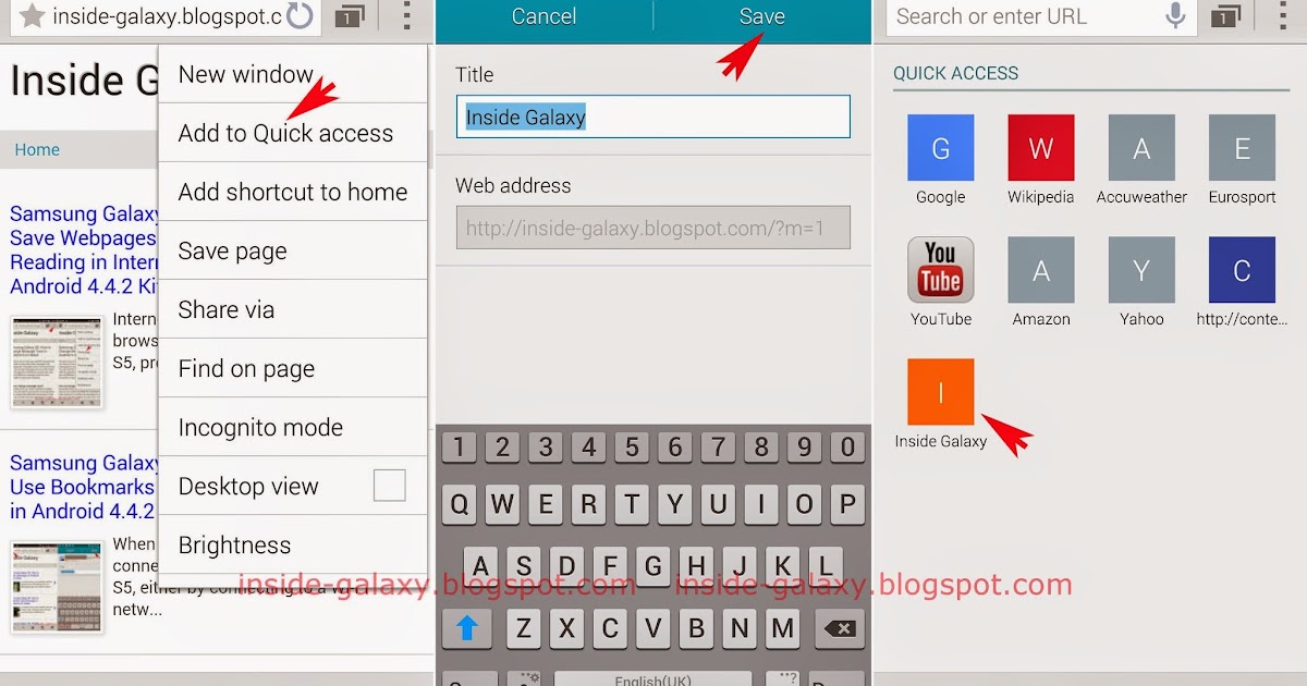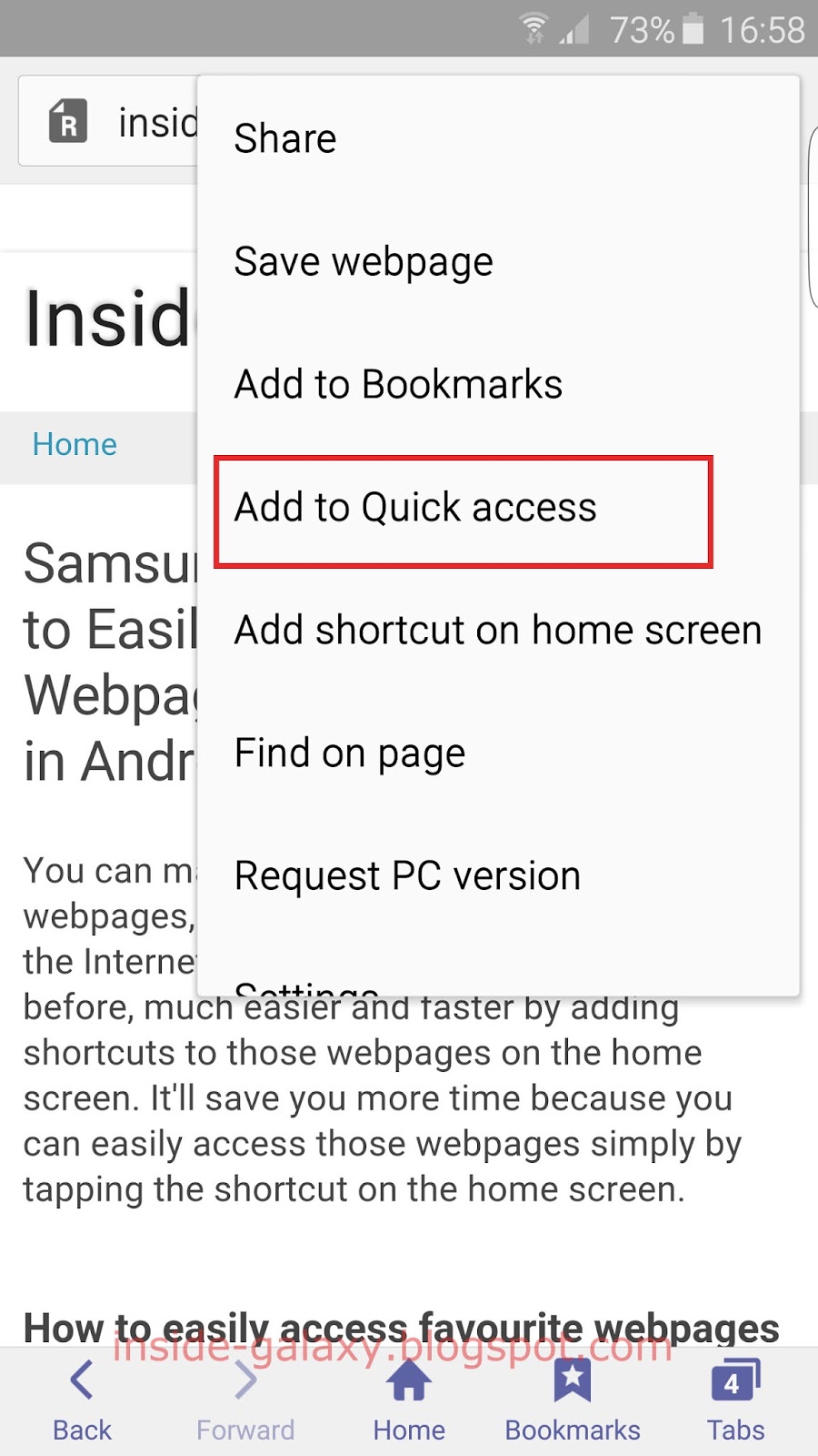 How to add a webpage to the quick access? You can easily add a webpage to the quick access by using the following steps: Open Internet app . Tap the address bar and then enter the required address of a webpage and then tap Go .; Once the webpage is fully loaded, tap or long press the Recent apps key to open up the additional options and then select Add to Quick access .