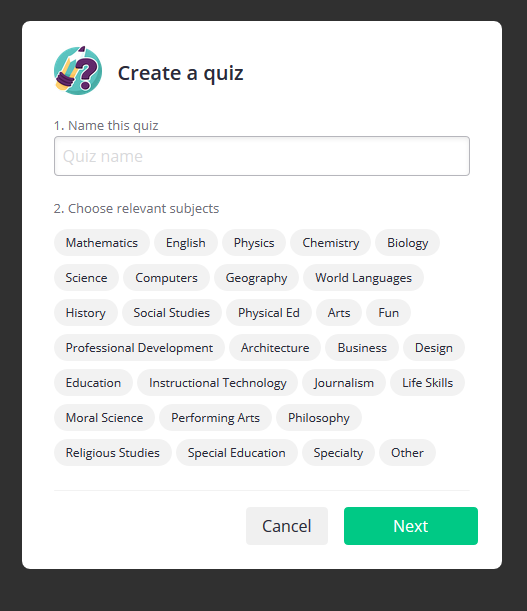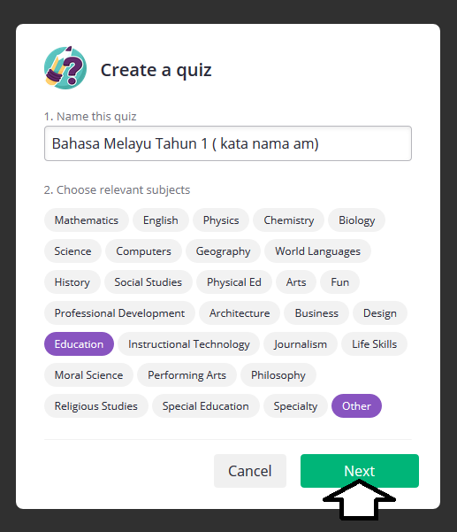 Setelah anda klik create a new quiz, anda dapat lihat 2 perkara yang anda perlu ini pada ruangan create a quiz iaitu Name this quiz dan Choose relevant subjects. Pada ruangan Name this quiz, anda perlu meletakkan tajuk kuiz anda contohnya Matematik tahun 3 dan sebagainya. Choose relevant subject pula ialah kuiz yang hasilkan nanti adakah ia matapelajaran yang ada pada ruangan ini jika tiada jangan panik. Anda klik other.