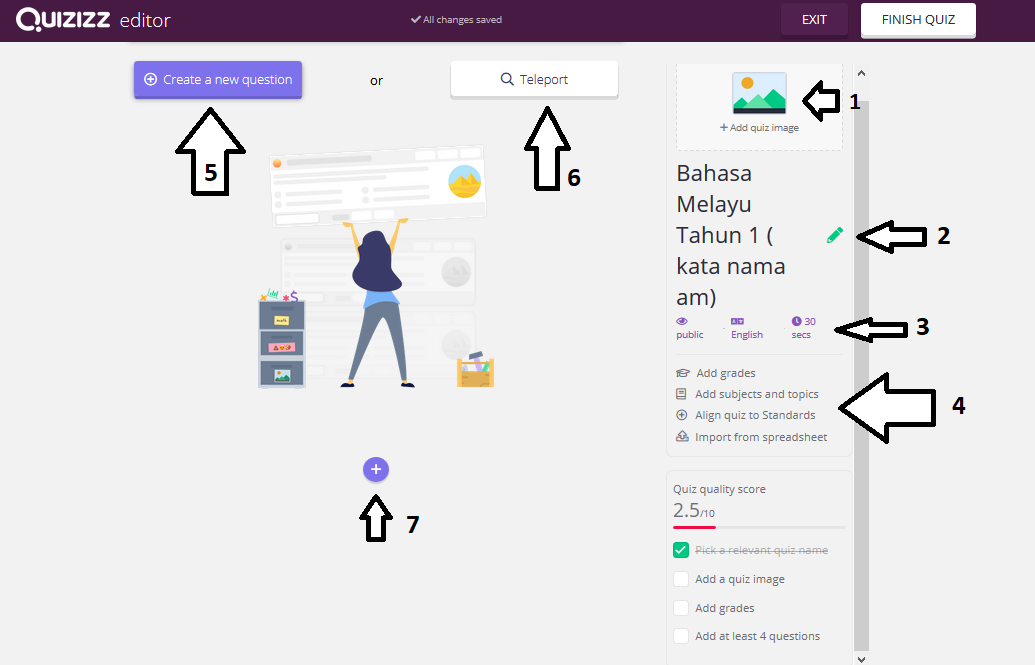 Untuk buat kuiz anda klik anak panah no 5 dan 7. Rajah di atas merupakan platform soalan yang kosong dan perlu kita isi dengan soalan dan jawapan.