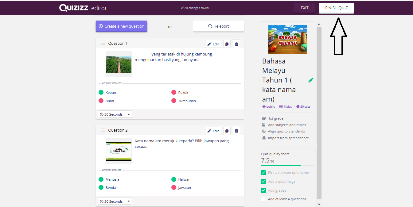 Akhir sekali anda klik finish quiz selepas anda semak soalan dan jawapan.