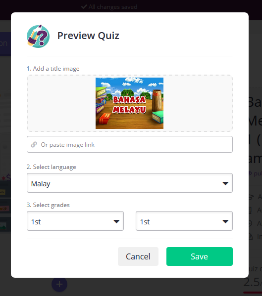 Admin mohon anda semua klik add quiz image. Untuk add quiz image terdapat 3 perkara yang anda perlu tahu dan lakukan iaitu add a title image, select language dan select grades. Add a titile image sebenarnya bukan wajib tetapi ia merupakan tarikan untuk murid atau anak-anak kita dalam menjawab kuiz. Terdapat 2 cara untuk upload image iaitu upload dari komputer / laptop anda atau anda boleh copy url / link google image dan paste di ruangan Or paste image link. Select language pula anda boleh tetapkan sama ada bahasa melayu (malay), english, cina atau tamil. Last sekali select grades. anda boleh pilih sama ada kuiz ini sesuai untuk tahun berapa. Anda perlu ingat bahawa grades ini digunakan oleh negara luar Malaysia iaitu US dll. Admin anggap je lah grades 1st untuk tahun satu. Setelah semua ruangan telah di isi, seterusnya klik Save