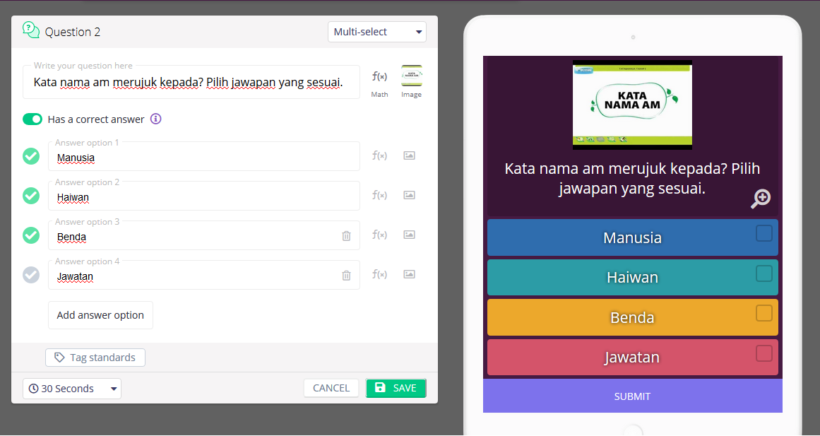 Ini pula soalan multi-select iaitu soalan yang lebih dari satu atau susanan. Caranya sama cuma anda perlu ubah bentuk soalan dari single answer kepada multi-select. Jangan lupa letak jawapan ye dan juga klik save