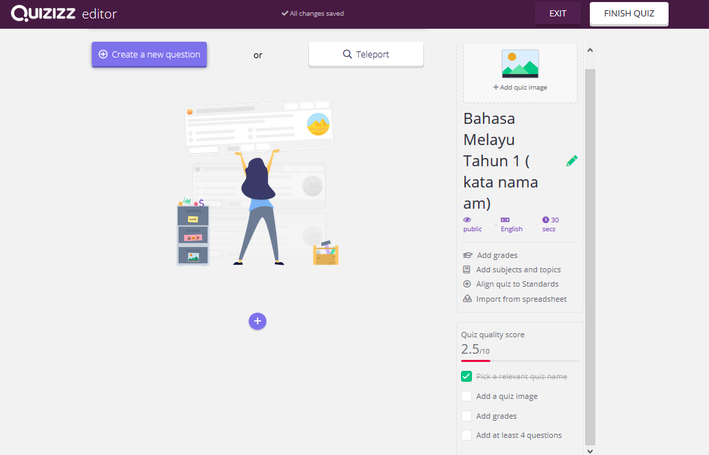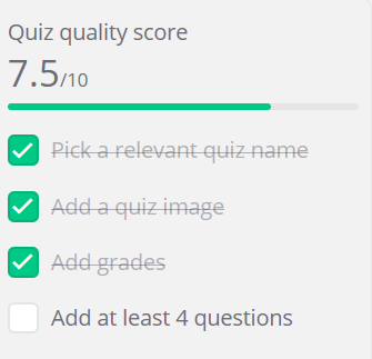 Apa ini admin?. Ini merupakan KPI kita dalam membentuk kuiz. Terdapat 4 standard kpi yang kita perlu lakukan untuk mencapai 10/10 iaitu pick a relevant quiz name, add a quiz image, add grade dan add at least 4 questions. Jangan risau jika anda mengikuti langkah demi langkah tutorial ini maka 10/10 dalam gengaman kita. Seterusnya KPI kita ialah buat soalan. Sabar ye x lama lagi kita akan buat soalan.