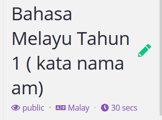 Pada ruangan ini, admin xtau nak letak namanya kerana ia amat penting untuk anda semua tahu. Anda boleh ubah tajuk kuiz anda jika ada kesilapan tanpa kembali kepada menu atau delete. Anda perlu klik icon pencil berwarna hijau dan ubah. Untuk icon mata pula anda boleh ubah kuiz anda ini dapat di lihat oleh public (awam) atau private. Di sini anda boleh edit language dan akhir sekali anda boleh ubah masa setiap soalan yang di lakukan. Bukan 10 soalan kuiz kena jawab 30 saat ye tapi 1 soalan 30 saat diberikan.