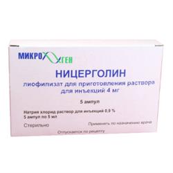 Форма выпуска, упаковка и состав препарата Ницерголин . Лиофилизат для приготовления раствора для в/м введения . 1 амп . ницерголин . 4 мг . Растворитель: натрия хлорида р-р 0 .9% (5 мл) . 4 мг - ампулы (5) в комплекте с растворителем (амп . 5 шт .) - пачки картонные .
