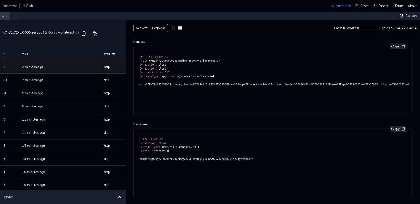 В течение нескольких часов после загрузки пакета я получил ответ с несколькими данными, такими как имя хоста, каталоги, IP-адрес, имя пользователя, на мой сервер сервер interact.sh.