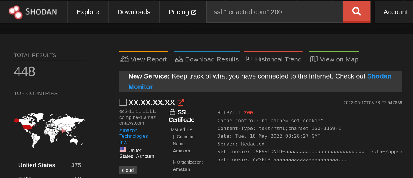 Я начал с разведки в Shodan и, используя приведенный ниже Shodan дорк, я нашел IP-адрес, принадлежащий redacted.com.