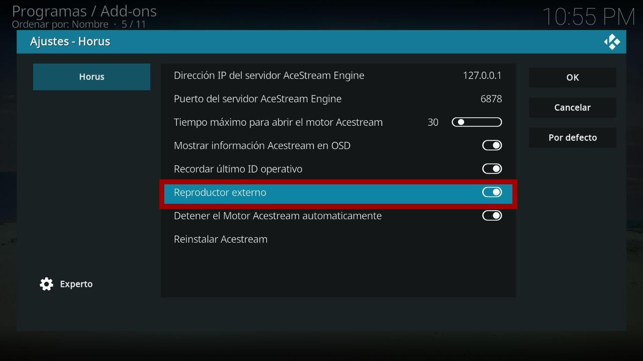 Activamos la casilla de Reproductor externo. Y ya tenemos Horus configurado.