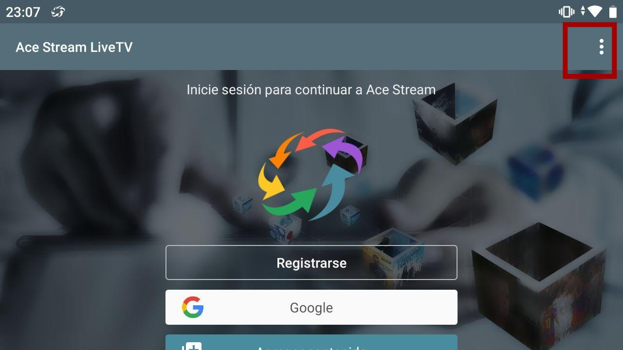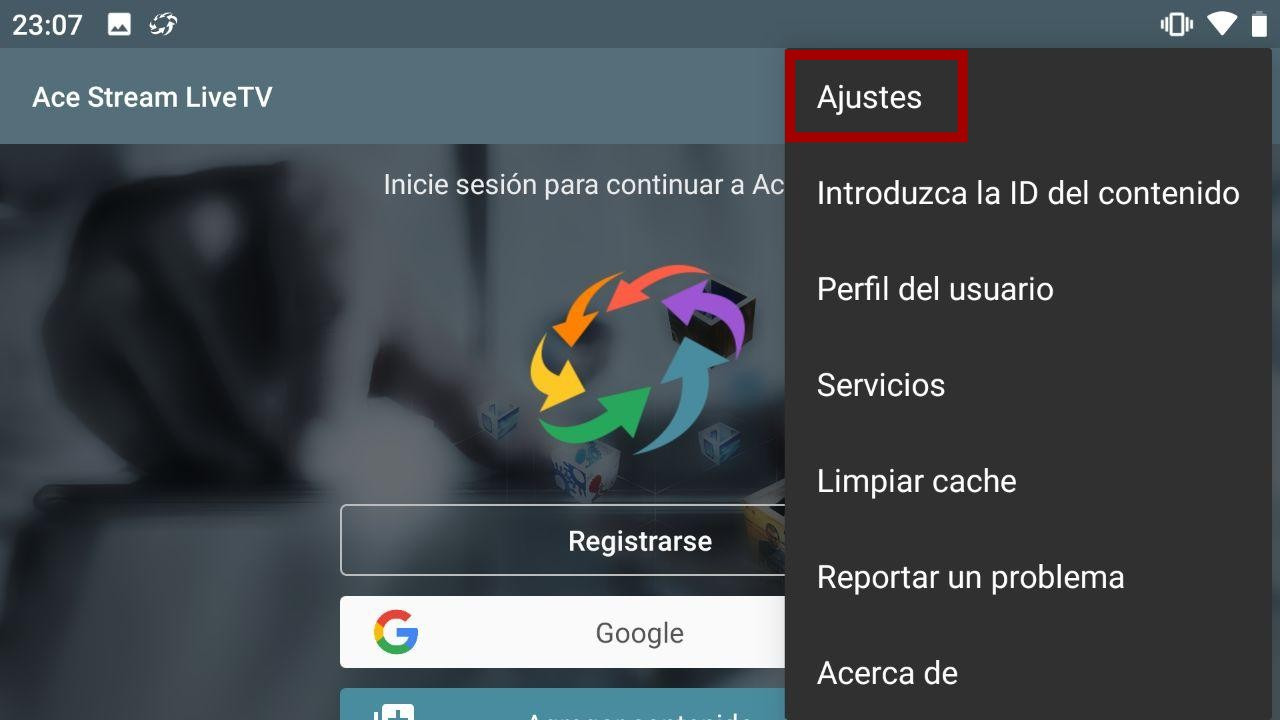 Las siguientes imágenes pueden variar según la versión de Acestream que tengamos, pero se trata de entrar en Ajustes o Configuración. En este caso primero es Ajustes.