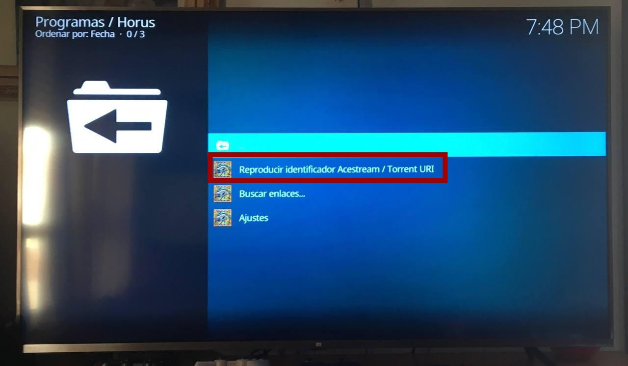 Una vez instalado, reiniciamos kodi, y podemos probar desde Horus si la instalación es correcta, pulsando sobre “Reproducir identificador acestream.”