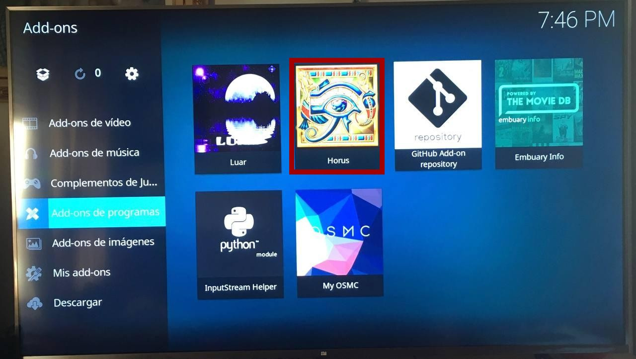 Entramos en los ajustes de Horus. Pulsación larga sobre el addon (o clic derecho ratón) y luego en Ajustes.