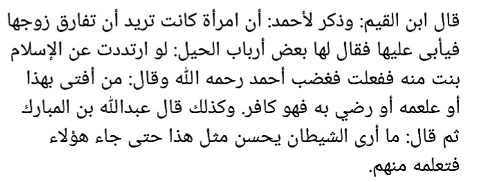 Сказал ибн Каййим: И сказали Имаму Ахмаду: Что одна женщина хочет развестись со своим мужем и он отказывается от этого, и сказали ей некоторые из больших (шейхов), обладающих хитростью: "Если отступится эта женщина от Ислама [т.е совершит какой то куфр] (то развод получится автоматически) ", и она сделала это. И разгневался Имам Ахмад и сказал: Кто дал такую фатву или обучил ею или доволен ею - является кафиром!