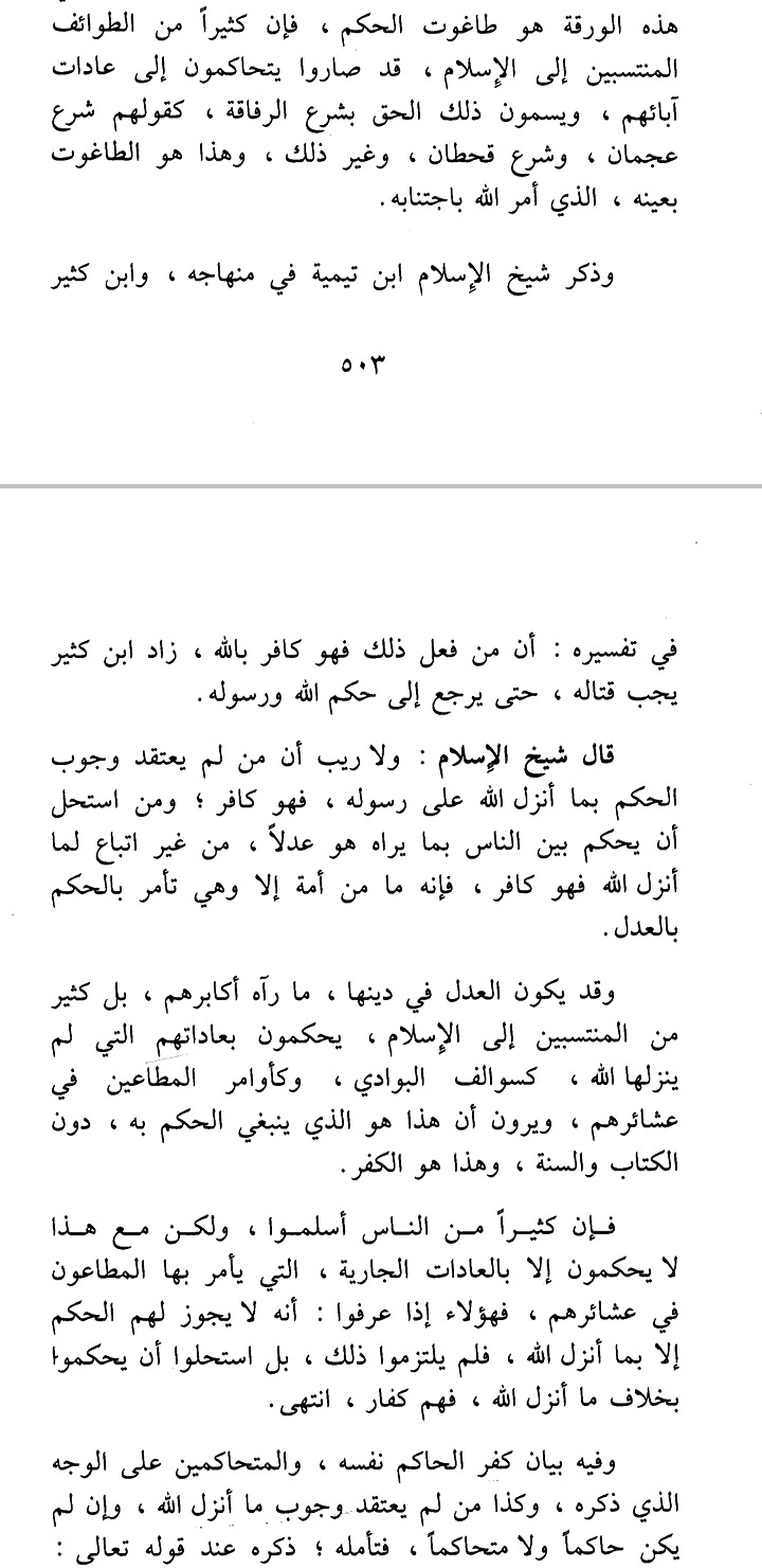 Поистине многие группы, которые причисляют себя к Исламу, обращаются за суждением к традициям их предков и называют истиной соответствующие законы, как закон Аджмана или закон Кяхтана и другие (законы каких-то племен), а это и есть тагут, которого Аллах приказал избегать. Упомянул Шейх аль-Ислам Ибн Таймия в своей книге «Минхадж» и Ибн Касир в своем «Тафсире» что тот, кто совершает это (судится иным законом помимо того что ниспослал Аллах), является кафиром в Аллаха! Ибн Касир добавил, что является обязательным сражаться с ним, до тех пор, пока он не вернется к хукму Аллаха и Его посланника ﷺ. Сказал шайхуль-Ислям: Нет сомнений в том, что тот, кто не убежден в обязательности судить по тому что ниспослал Аллах своему посланнику ﷺ, является кафиром. И тот, кто разрешил судить между людьми тем, что он сам считает справедливым, не следуя тому, что было ниспослано Аллахом — тоже является кафиром. Поистине, нет такого народа, который не повелел бы судить по справедливости (т.е все они считают что поступают справедливо), и справедливым в религии того или иного народа считается то, что соответствует мнению представителей его знати. И даже многие из тех, кто причисляет себя к Исламу, судят по своим обычаям, которые не были ниспосланы Аллахом, как например по обычаям распространенным среди бедуинов, или выполняя приказания своих правителей, и считают (по тем или иным причинам), что судить следует на основании подобных вещей в обход Корана и Сунны — а это и есть куфр! Поистине, многие люди покорились но они продолжают судить с помощью действующих среди них обычаев, придерживаться которых велят им их предводители. И когда они узнали, что им не разрешено судить ничем, кроме того, что ниспослал Аллах, они не последовали этому, однако они разрешили судить тем, что противоречит ниспущенному Аллахом — они являются кафирами! [конец его слов].