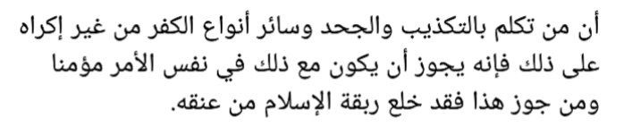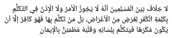 «Нет разногласий между мусульманами (иджма уммы), что не разрешено ни приказывать, ни разрешать произношение слов куфра, ради любой цели из числа целей, и тот, кто произнесет его – будет кафиром, кроме того кто был под икрахом (принужден), и он сказал это своим языком, когда его сердце было спокойно на вере».