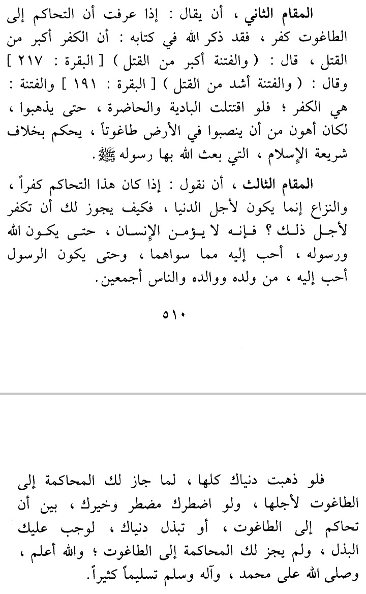 ﻭﻣﻦ ﺣﺎﻛﻢ ﺧﺼﻤﻪ ﺇﻟﻰ ﻏﻴﺮ اﻟﻠﻪ ﻭﺭﺳﻮﻟﻪ ﻓﻘﺪ ﺣﺎﻛﻢ ﺇﻟﻰ اﻟﻄﺎﻏﻮﺕ، ﻭﻗﺪ ﺃﻣﺮ ﺃﻥ ﻳﻜﻔﺮ ﺑﻪ، ﻭﻻ ﻳﻜﻔﺮ اﻟﻌﺒﺪ ﺑﺎﻟﻄﺎﻏﻮﺕ ﺣﺘﻰ ﻳﺠﻌﻞ اﻟﺤﻜﻢ ﻟﻠﻪ ﻭﺣﺪﻩ ﻛﻤﺎ ﻫﻮ ﻛﺬﻟﻚ ﻓﻰ ﻧﻔﺲ اﻷﻣﺮ.