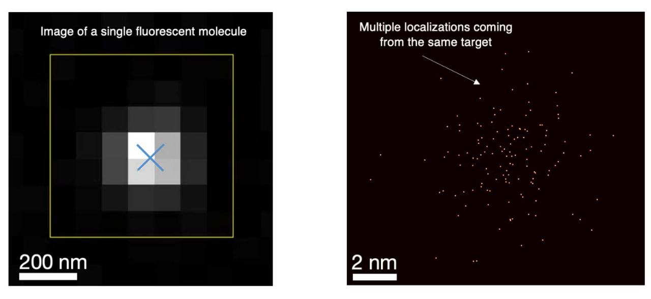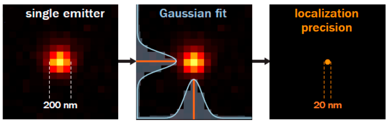 Фиксировать сигнал флуоресценции точечных источников света физики умееют: несмотря на то, что даже один наноразмерный флуорофор будет виден в микроскоп как расплывчатое пятно в 200 нм в диаметре — ведь дифракцию никто не отменял — центр эмиссии и, соответственно, локализацию мишени можно рассчитать математически, аппроксимировав «пятно» гауссовой функцией.
