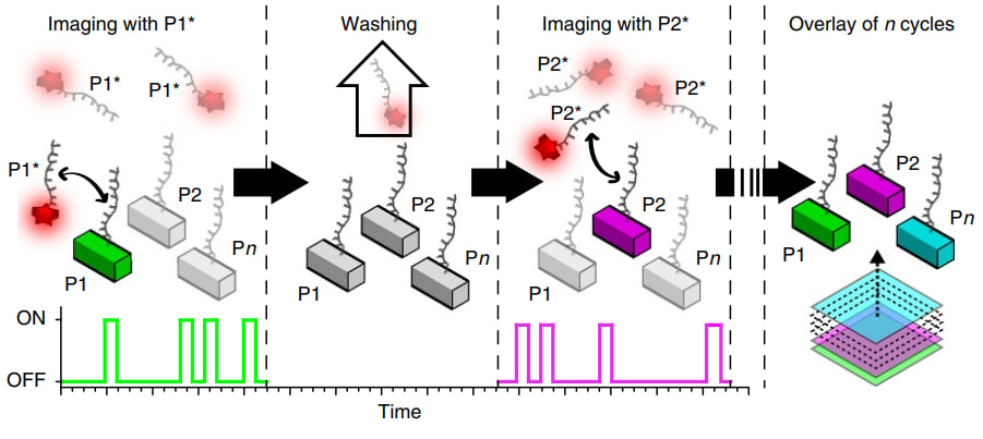 Исследователи маркируют мишень первым олигонуклеотидом ДНК, сшитым со специфическим антителом. Затем добавляют уже флуоресцентно меченные ДНК-зонды. Наблюдается случайное мерцание редких флуорофоров: ученые только фиксируют изображения, как и в любом другом стохастическом методе. Эта изящная, но довольно времязатратная техника была разработана немецкими учеными из Института биохимии Макса Планка под руководством Ральфа Юнгманна в 2014 году.
