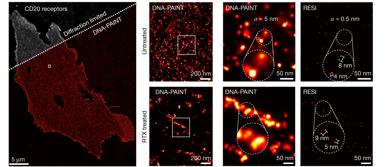 Наконец, специалисты применили RESI для наиболее практически значимых целей: специалисты изучили взаимодействие противоопухолевого моноклонального антитела Ритуксимаб со своим рецептором CD20 в мембране интактных клеток. Клеточные биологи давно пытаются понять, какую форму имеют кластеры CD20: линейную или кольцевую. Группа Юнгманна наблюдала за организацией олигомеров CD20 при связывании с терапевтическими антителами и подтвердила гипотезу о сборке линейных цепочек мембранного рецептора.