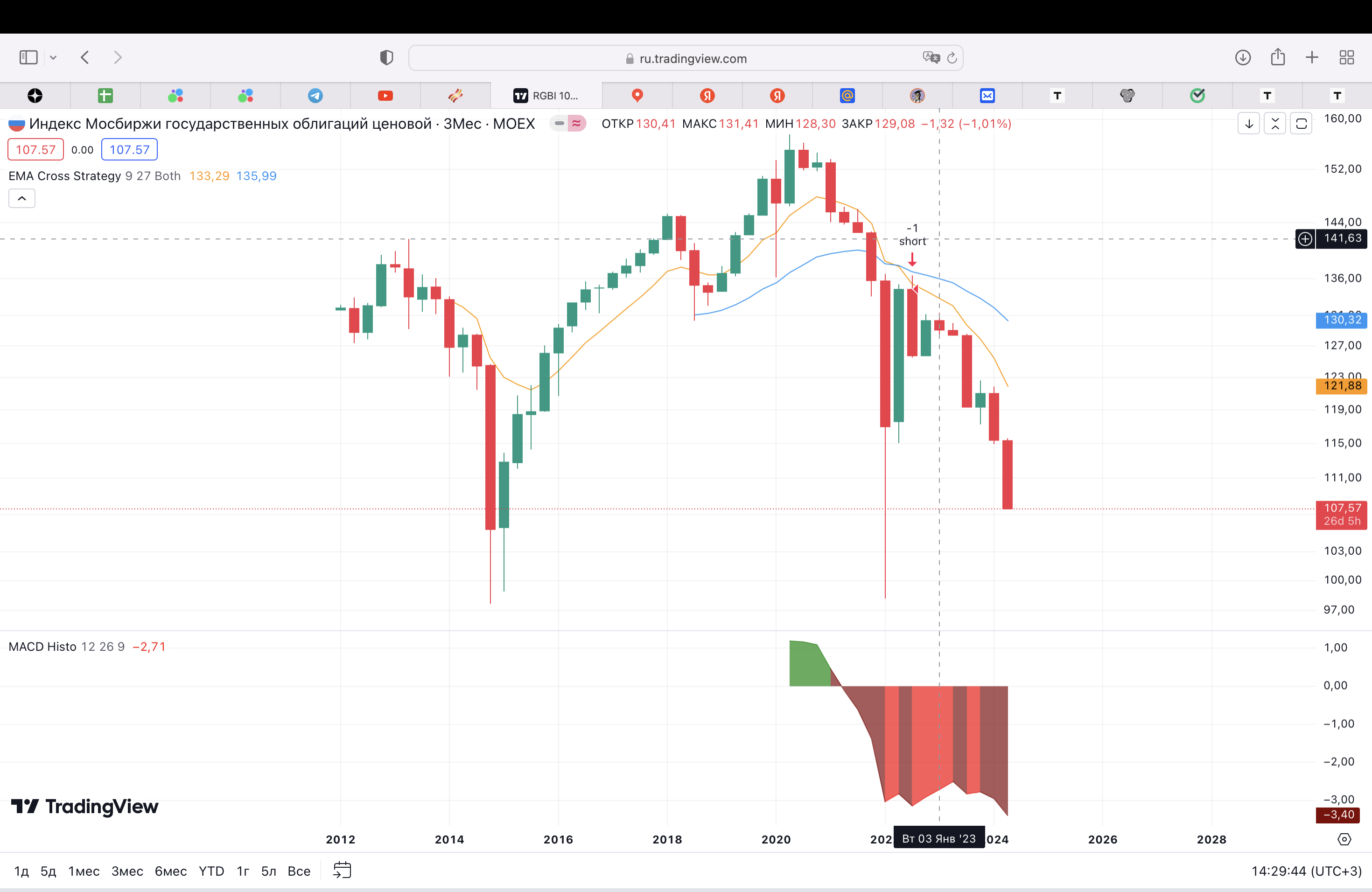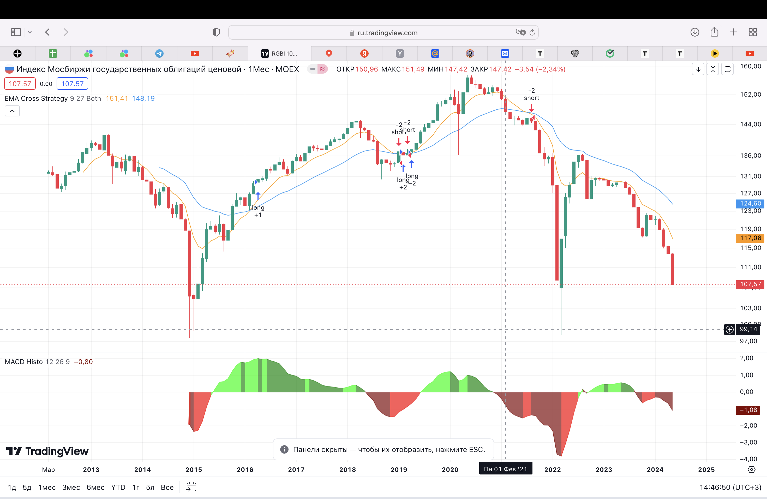 Самый наглядный график, простой и понятный. Среднее значение индекса проходит в диапазоне 120-130. Сильные отклонения наблюдались в 2014, 2022 году на всем известных событиях, которы влекли задирание ключевой ставки ЦБ вверх под 20%, следствием чего являлось падение котировок облигаций и в целом индекса. На графике это выражается в сильном отклонении от скользящих, перепроданных индикаторах.