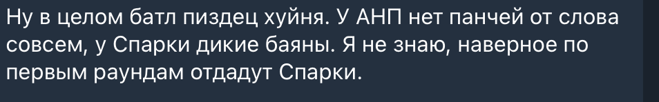 Из уже прошедших батлов выделяю приемлимыми (!) третий раунд Трейса и Димы, третий раунд Тилса и Рейбакса, третий раунд Нищеты. Но, так чтобы выйти с колонкой и орать текст Соула под джанки кэта - такого больше нет. И это дико удручает. 220 и милфы были бы открытием сезона, но они делают одно и тоже, и как бы достойны каких-то мэйнов слова саранск, но не больше. Я буду рад ошибиться, и выждать полуфиналов, которые будут настолько горячие, что чайник свиснет, но чем дольше ждем тем меньше верим.
