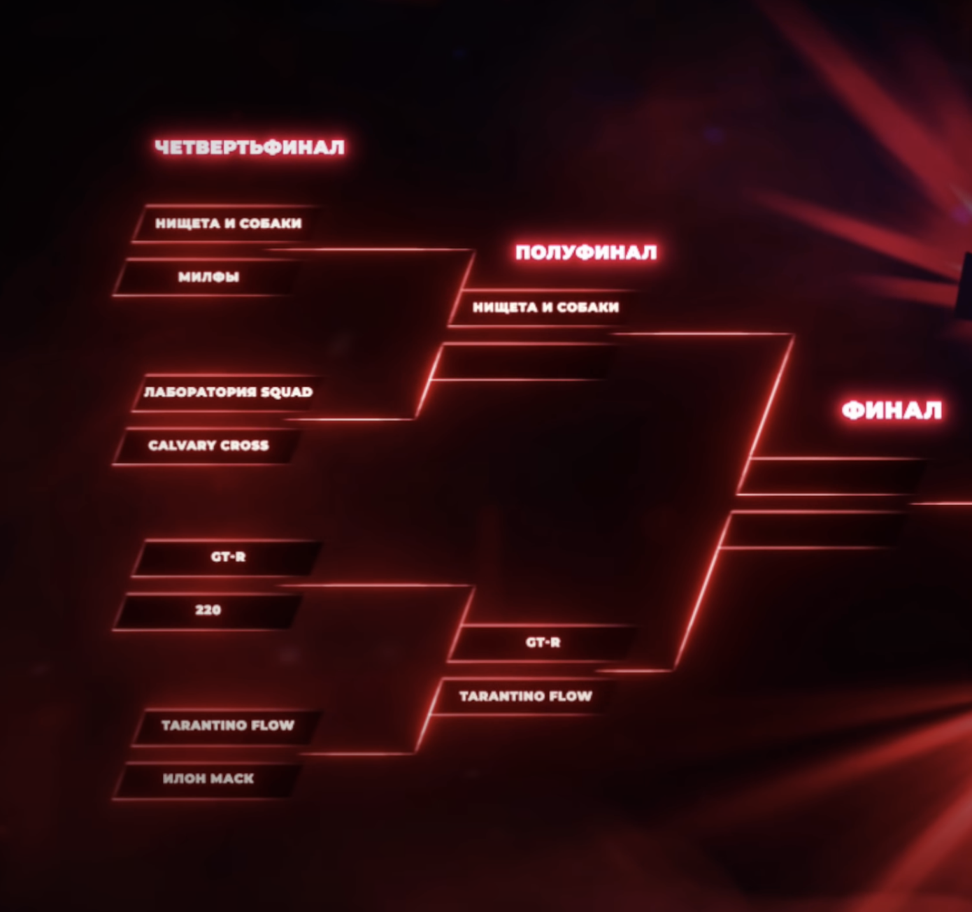 Вот хоть убейте, я не могу запомнить их ники и что они показывали в батлах, ибо они совершенно не запоминающиеся, и большая их часть вообще не звучит на битах. Ну, блин, а могло же получится интересно: берем Отто, который уже раз сто сказал что не будет участвовать, снимаем ему телок чтобы он батлил. Ну, рили, уговорить же можно было, но Рифмобес знает лучше. Берем Скири, хоть он и не приехал, все ж знают что Скири умеет если нужно. И берем Рифмабеса, а хули, он как ведущий заставляет меня сраться в штаны, пусть пугает весь сброд который они набрали. В итоге у нас могли бы получиться батлы Отто х Рифмабес, Отто х Скири, Скири х Рифмабес и так далее. А так, я вообще не ебу кого пропустят в полуфиналы, ибо честно мне бы хотелось чтобы никто из них не проходил. Вот такие дела.