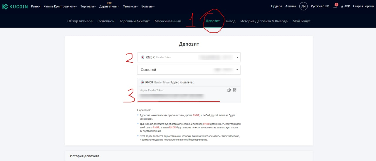 KuCoin либо Gate или других, где торгуется RNDR токен. Переходим в Депозит