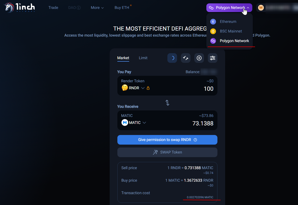 1. На примере DEX 1inch делаем обмен RNDR Токенов на токен Matic (предварительно переключив сеть в Метамаске и обменнике на Polygon)
